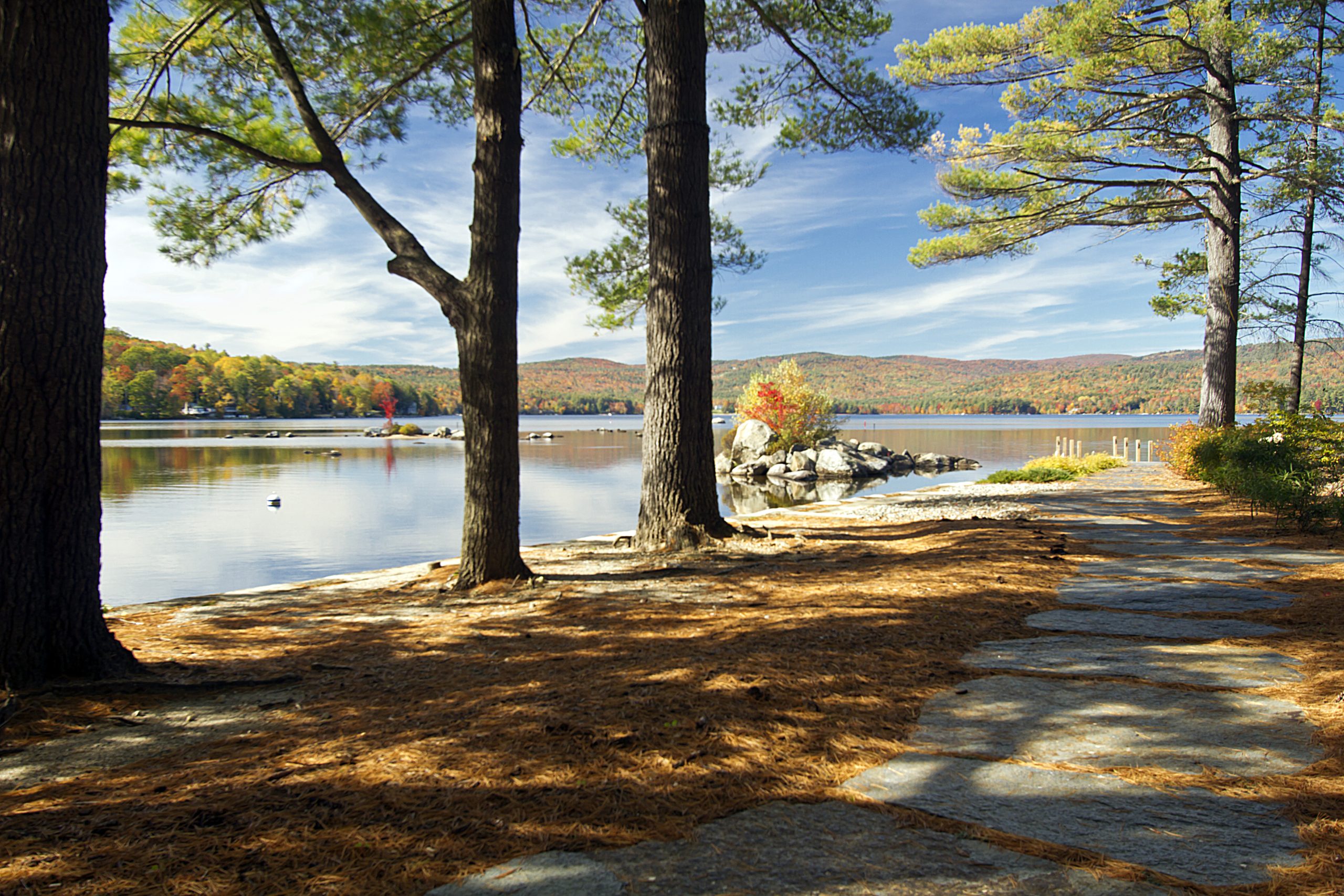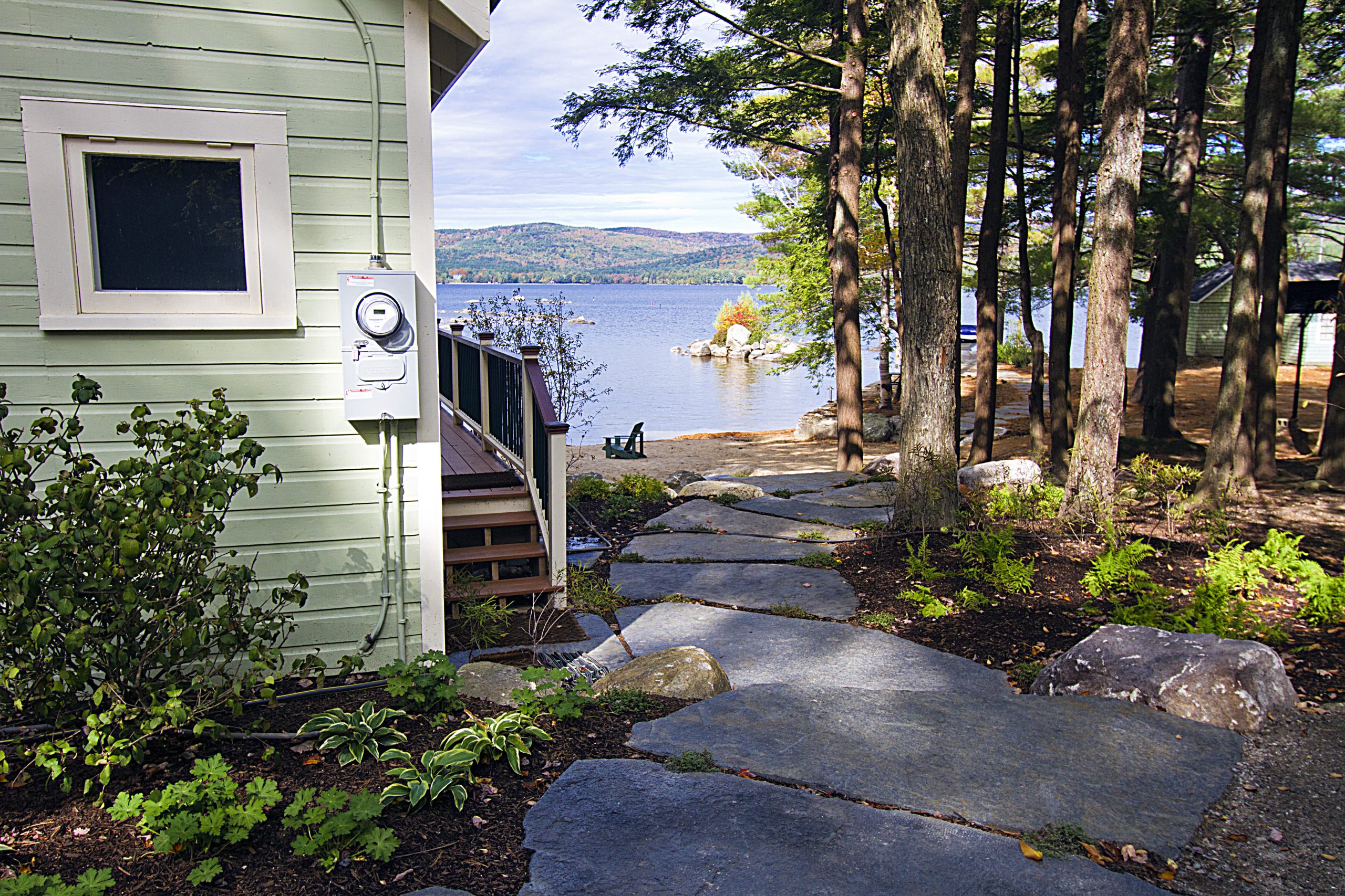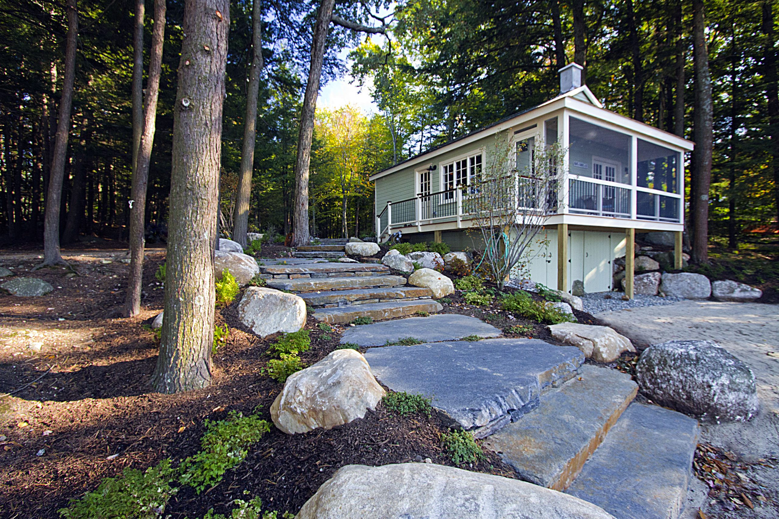 This project on pleasant lake in New London, NH involved reviving what was once a quaint summer cottage but had fallen into disrepair. The new owner decided to bring the back to life and restore its charm! Along with the refresh of the cabin db redesigned the landscape to functionally and aesthetically. Large slabs of granite schist were used for the walkways, stairs and gathering spaces. The large boulders from the site were reused as landscape features and stone walls. Native plantings were installed to blend the open areas with the surrounding forested areas.